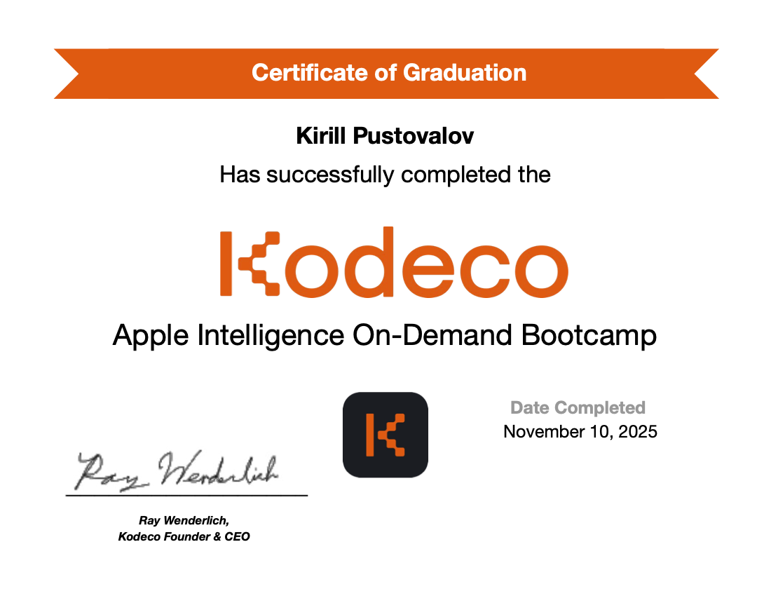 Trained custom ML models and integrated third-party AI into iOS apps, leveraging Apple’s on-device stack (Vision, Translation, Create ML, Apple Foundation Models) to build intelligent user experiences.